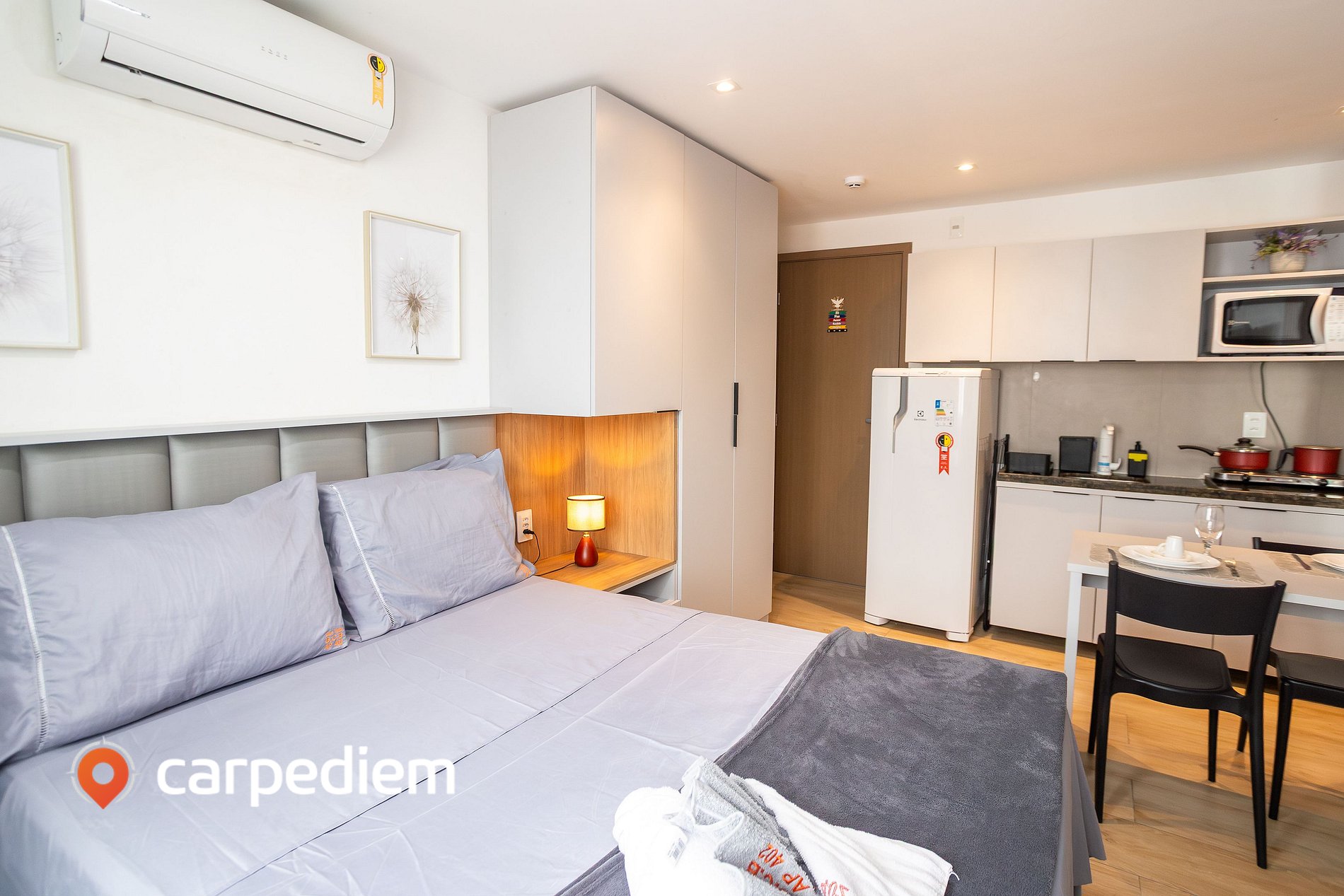 • Studio integrado: ambiente compacto e funcional, pensado para acomodar até 3 hóspedes com conforto. Conta com ar-condicionado, Smart TV, Wi-Fi e decoração leve que cria um espaço acolhedor para relaxar após um dia de praia ou passeios pela cidade.