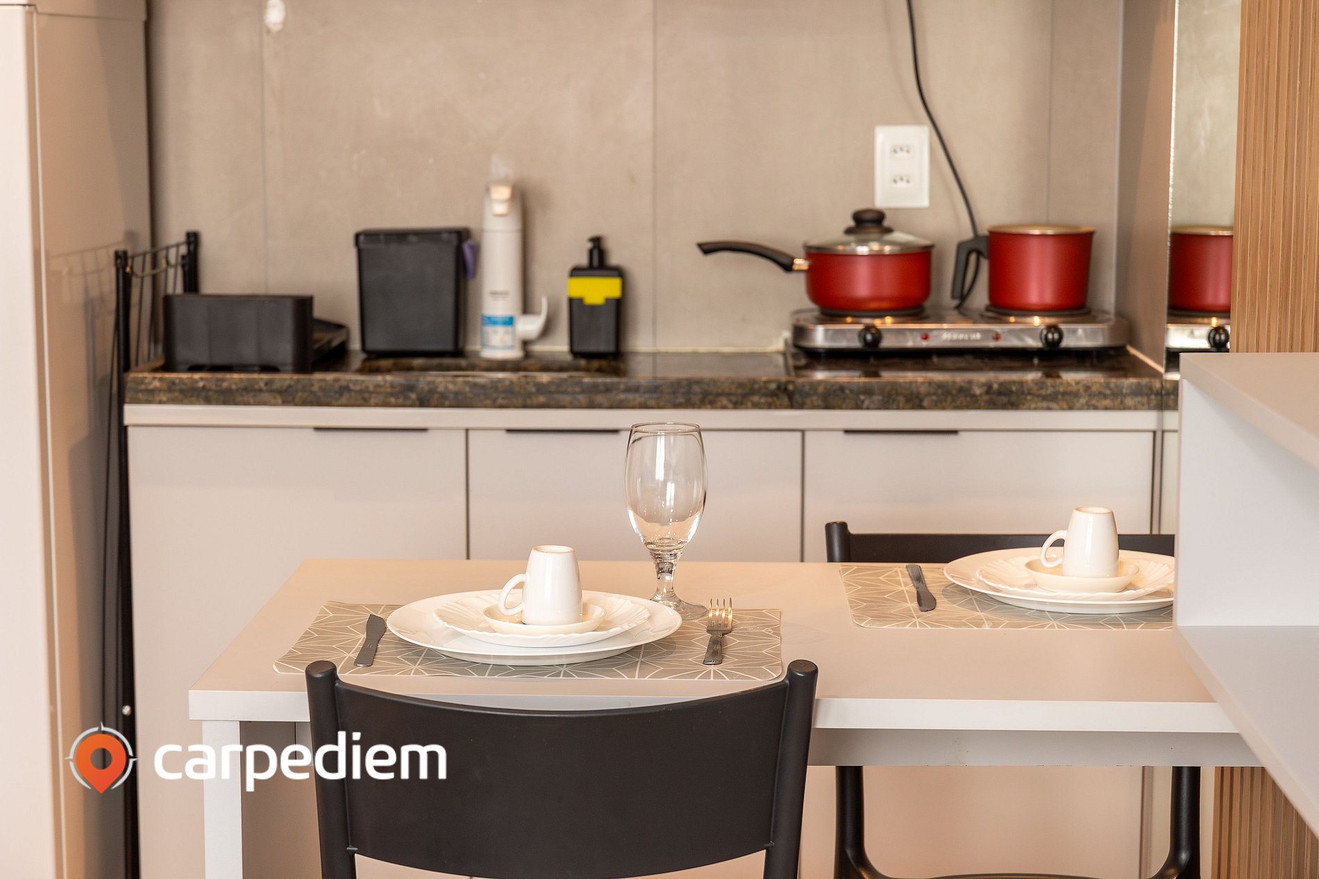 • Cozinha: prática e equipada para o dia a dia, com pia, bancada, armários e utensílios básicos que facilitam o preparo de refeições rápidas durante a estadia.